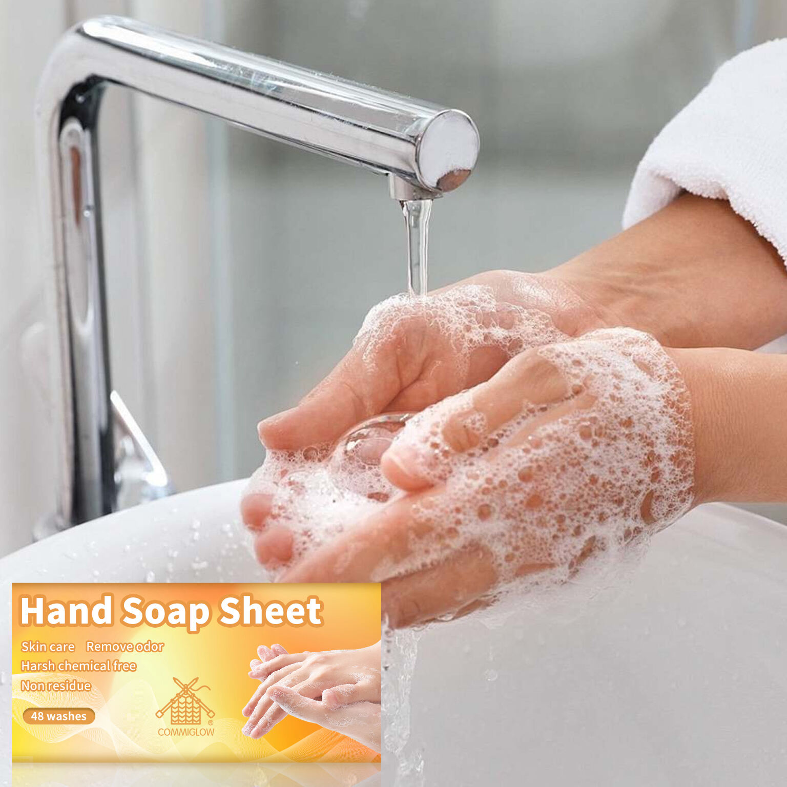 PORTABLE TRAVEL SIZE: COMMIGLOW Hand Soap Sheets are ultra-lightweight, compact, and easy to carry.Perfect for hiking, camping, school trips, and family travel, these dissolvable soap sheets provide a hassle-free alternative to bulky soap bars. Essentials in your travel for clean hands anytime, anywhere.